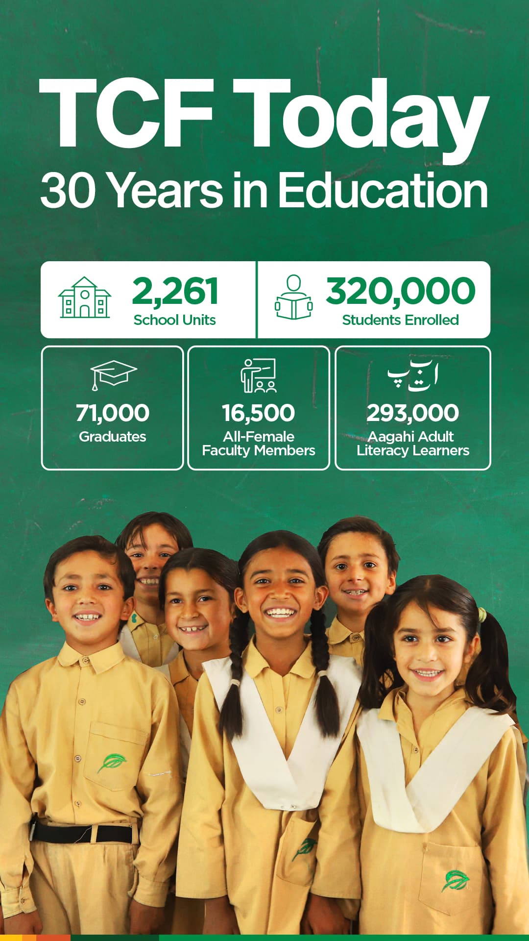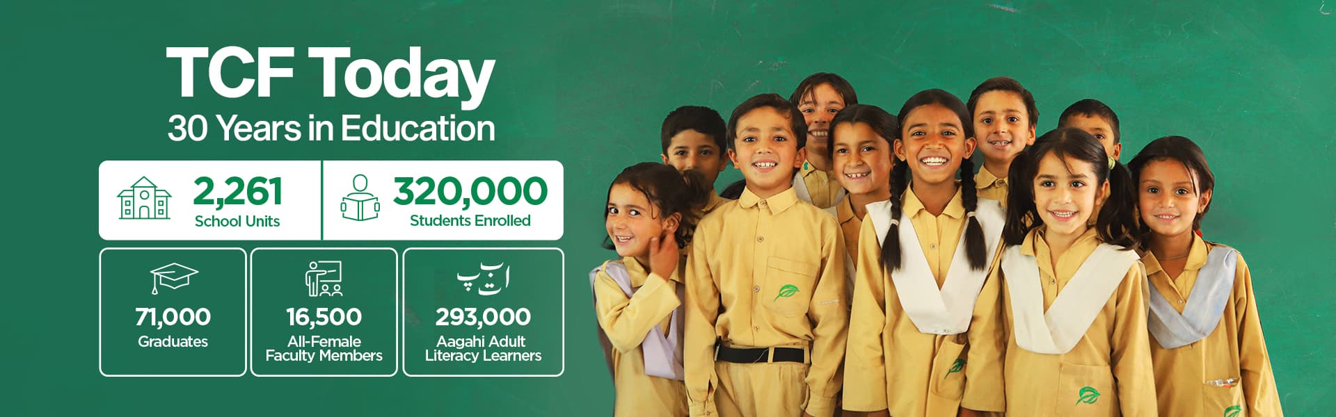 Association TCF Switzerland is a not-for-profit that supports the education of underprivileged children, and the programs of The Citizens Foundation (TCF) in Pakistan, one of the leading organisations in the field of education. TCF Pakistan was started in 1995 by a group of concerned citizens who wanted to bring about social change through education. In 30 years, it has built and operates 2,261 purpose-built schools providing quality education to 320,000 children with an all-female faculty of 16,500 teachers.